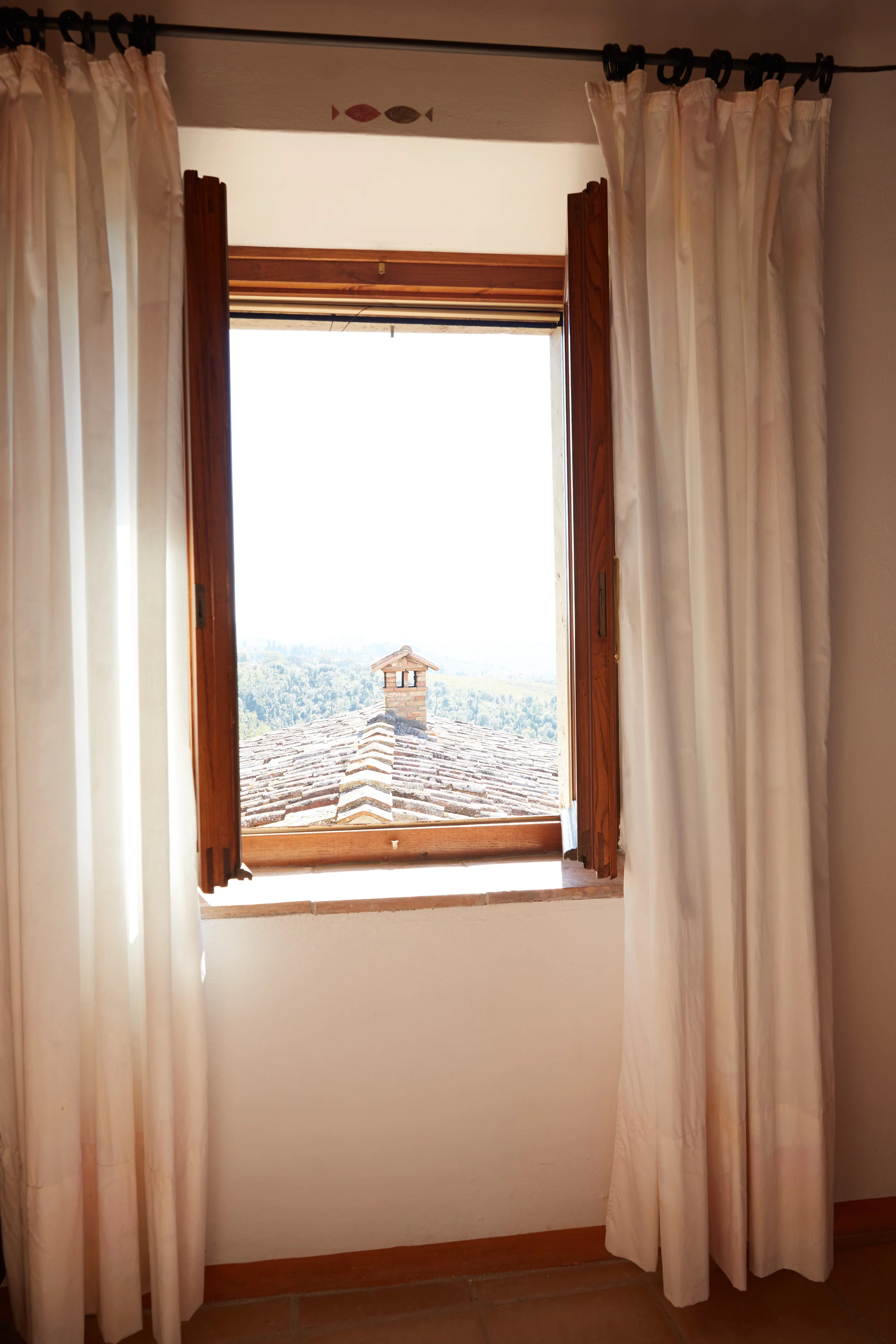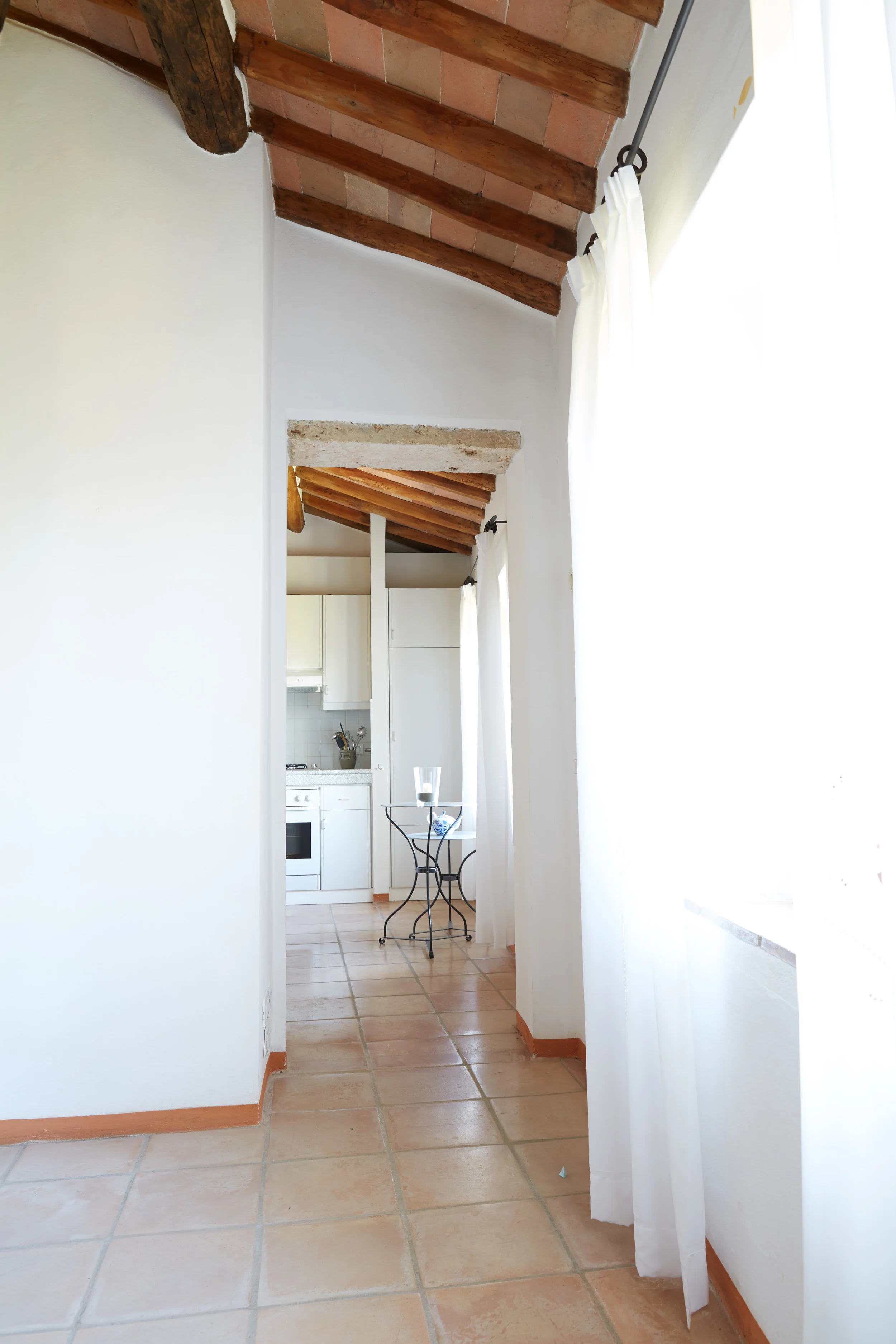 Gemütliche Wohnung im Obergeschoss des Hauptgebäudes. Die gemütliche Sitzecke mit Cheminée im Wohnzimmer und ein grosser Holztisch in der grosszügigen, offenen Küche laden zum Verweilen oder Lesen ein. Ein Doppelbettzimmer mit wunderschöner Panoramasicht Richtung Castellina und San Gimignano machen diese Wohnung ideal für Geniesser.