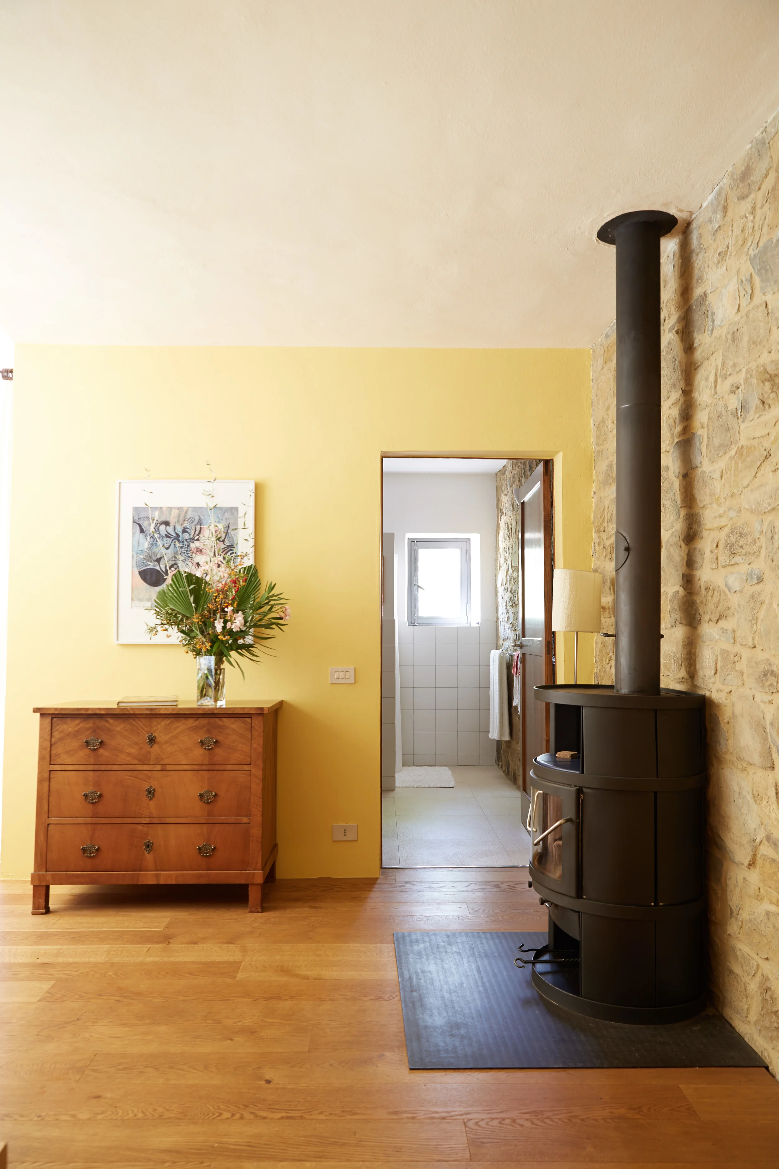 Moderne und bequeme Wohnung mit grossen Fenstern, Eichenholzboden, breitem Doppelbett und grossem Sofa. Holzheizung mit Cheminéeofen.