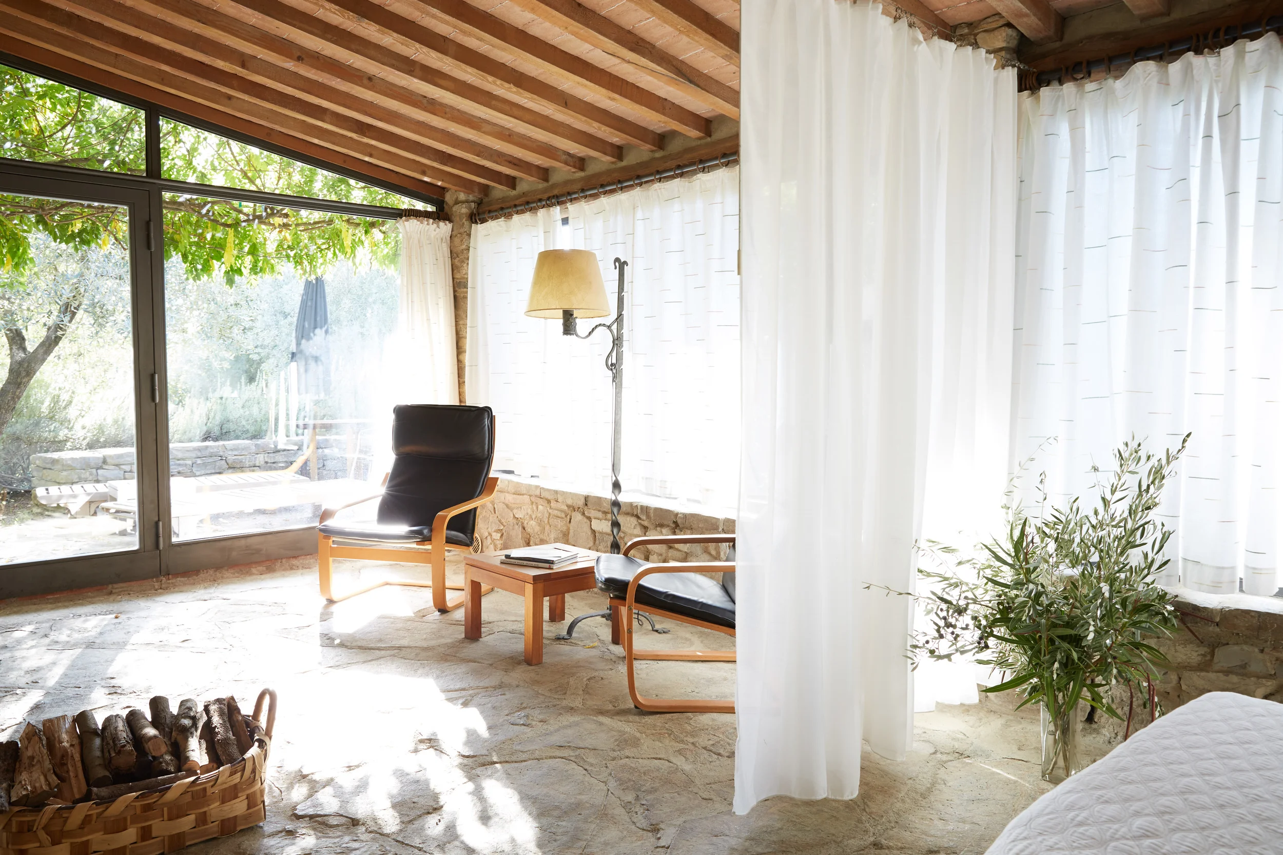 Grosszügiger Schlaf-/Wohn-/Essraum mit Natursteinboden, Cheminéeofen und privater Gartensitzplatz. Einfaches Badezimmer mit Dusche und WC.